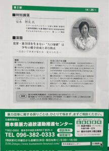 11月12日(水)、ホテル熊本テルサにて、「第35回 熊本県暴力追放県民大会」が行われ、当連合会からも参加しました。第2部では、スクールカウンセラー・公認心理士である、安永智美氏による「犯罪・暴力団を生まない“入口暴排”は少年の健全育成と非行防止」という演題で講演が行われました。出会いで未来が変わる・変えられるのテーマで、少年の健全育成を重点とした現状や取り組みについて講演され、深く考えさせられる内容でした。
